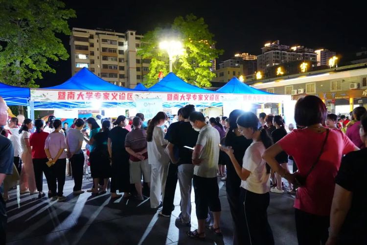 夜市上,青年医师许华冲、邱文慧、梁紫恩参加义诊,实践团设计了“节气之掷”和“中医药拓印”两个中医药科普互动展位,始兴县中医院等医疗卫生机构同时开展各类中医药服务,现场人气火爆,群众热情高涨。