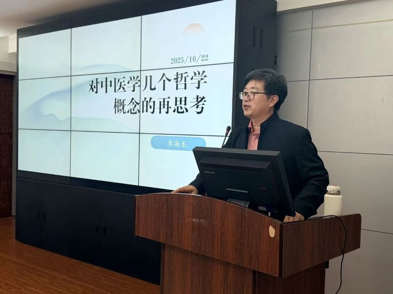 李海龙教授以《对中医学几个哲学概念的再思考》为题开讲。他以风趣幽默的风格,从“一和二谁在先”这一中国哲学问题出发,探讨了“阴阳”观念的生成逻辑,并提出“阴”在语言习惯上先于“阳”的文化意涵。他表示,“五行”并非指代五种静态的物质元素,而是一种基于“五象”的动态关系模型,是理解人体生理病理的关键“关系学”。随后,他进一步阐释了“象思维”作为中医认知世界的基础方法,并提出将“气”的概念理解为“气象”,强调其作为一种需要用“象思维”来把握的现象集合,超越了单纯的物质或能量范畴。