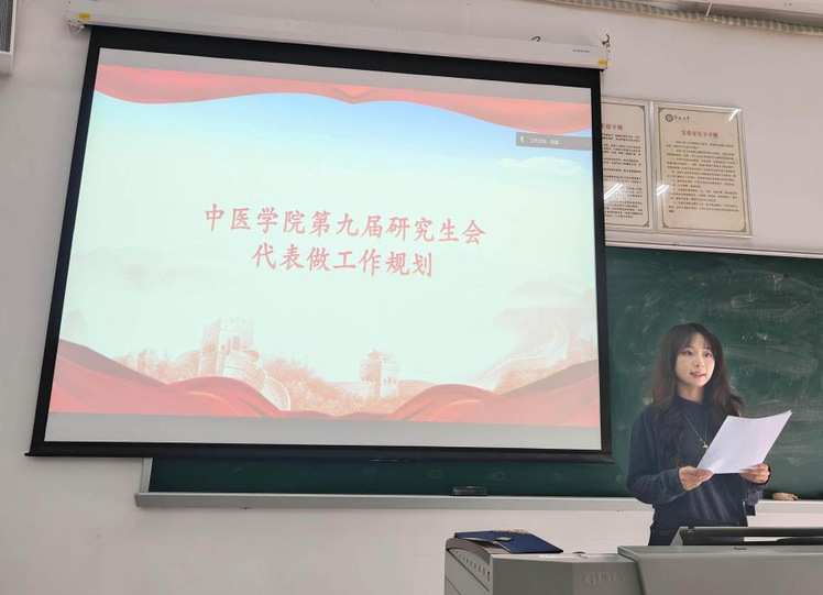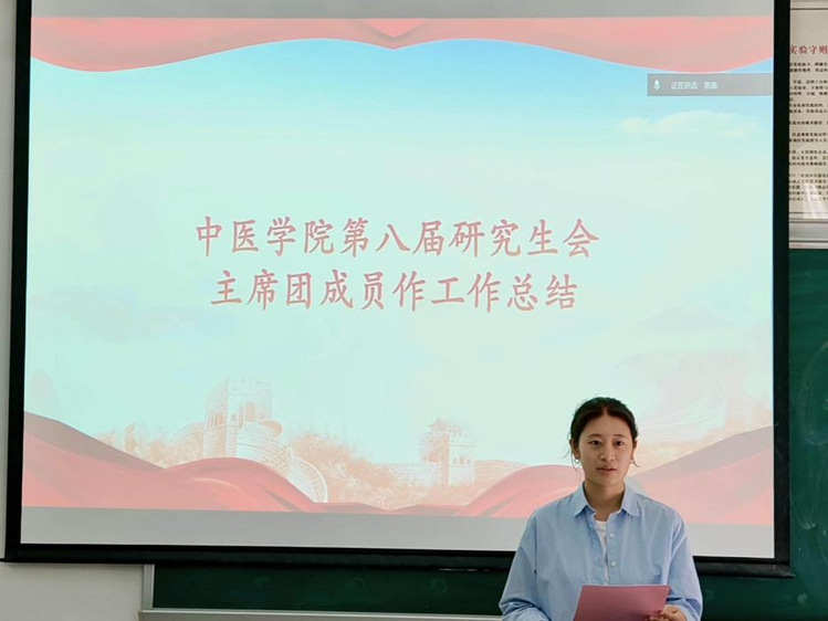 第八届研究生会代表石贝蕾作工作总结。她指出,学院研究生会积极践行跨学科交流和合作,与其他学院合作开展中医药特色活动,开展中医药特色志愿服务等。她用“服务、连接、成长”概括研会工作,并向全体成员的付出表示感谢,祝愿新一届研会工作顺利。