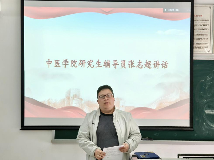 张志超在会上发言。他强调,研究生会的根本宗旨是:“引领同学,服务成长”,提出要以“热心”服务同学,以“匠心”传承中医,以“同心”凝聚力量,团结奋进,发挥研究生会的模范带头作用。