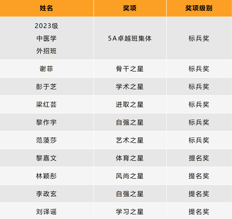 在暨南大学第十四届“5A卓越引领计划”评审中,学院2023级中医学外招班荣获“5A卓越班集体”标兵奖,中医学子荣获5项标兵奖和4项提名奖。